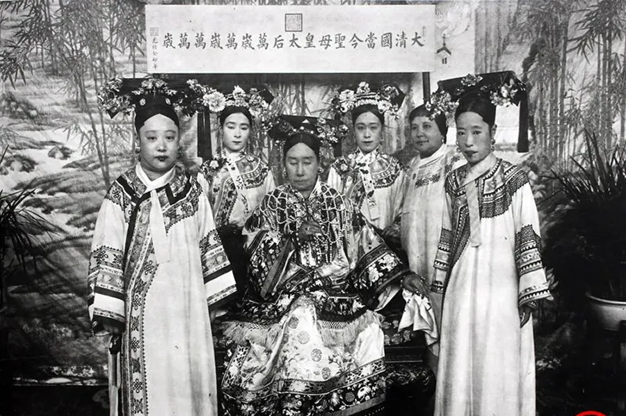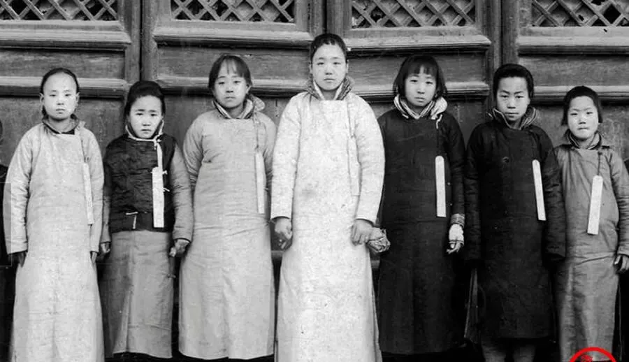 晚清老照片:秀女站成一排等待皇帝挑选,衣着朴素长相普通.