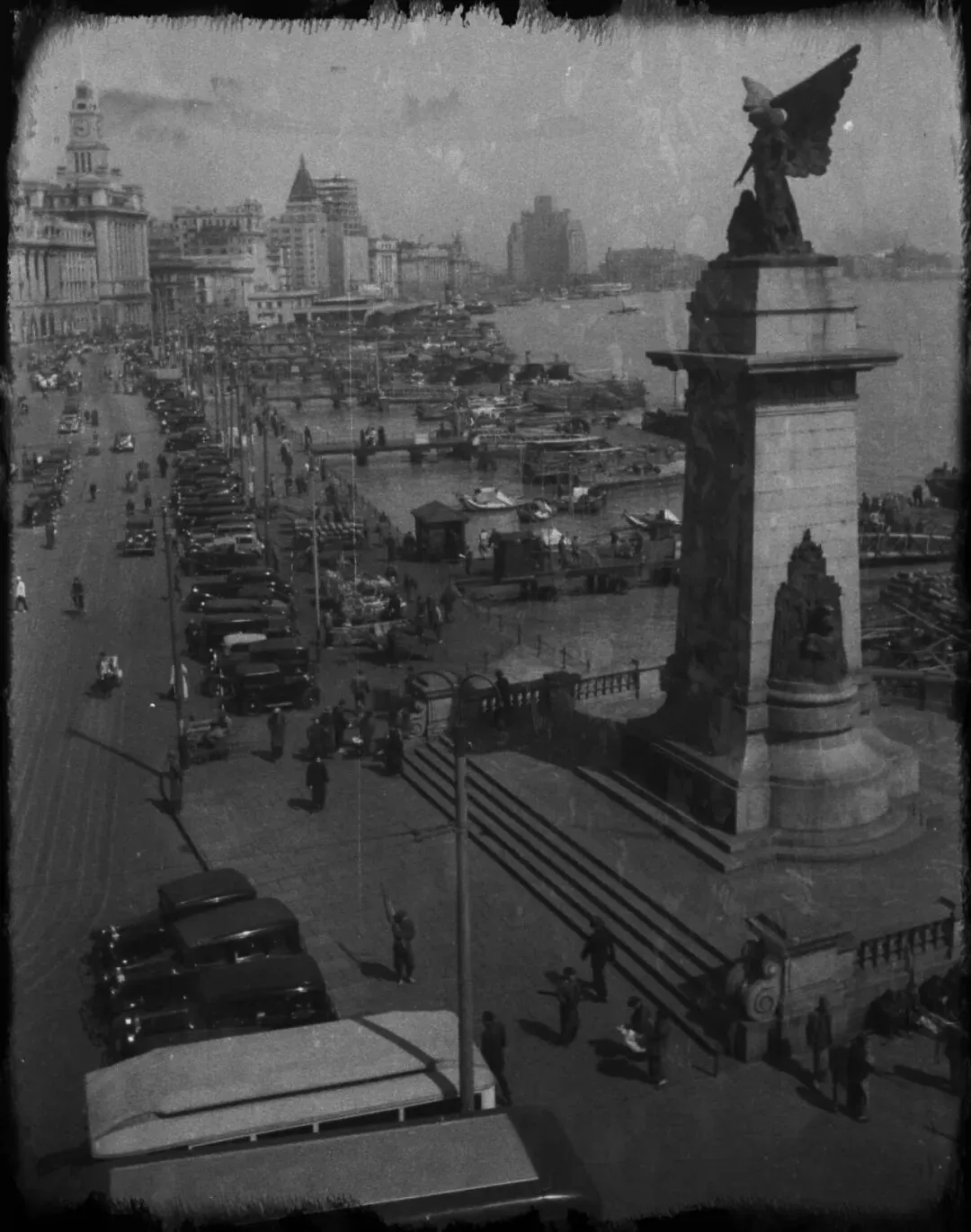外滩标志性的欧战纪念碑。雕像是展翅的和平女神,手持橄榄枝,是当时外滩南端的重要地标。这座纪念碑在 1941 年太平洋战争爆发后被日军拆毁。