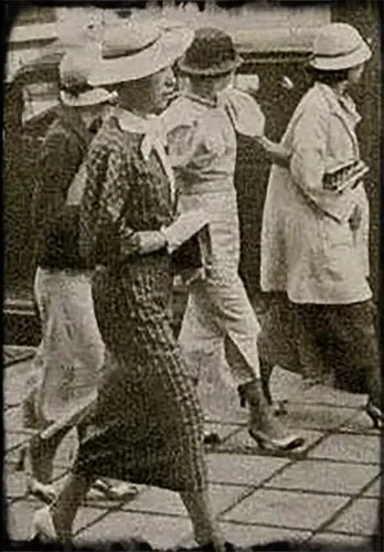 宽阔的马路上车水马龙,老式公共汽车、小轿车和黄包车,人行道上行人熙熙攘攘。江