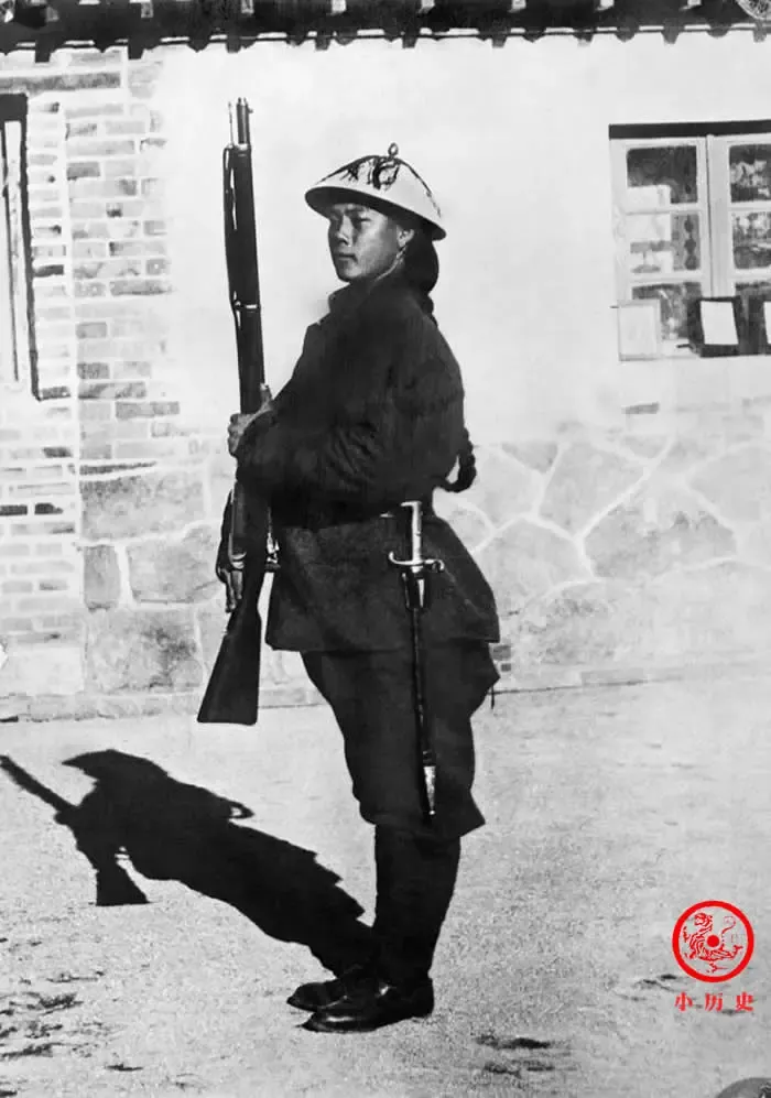 这种举枪立正的站姿,在清军传统的操典中是没有的,而是接受西方军事训练的结果。他全身的装备带有明显的过渡色彩,凉帽、肥大的服装都是清军早已有之的,佩剑、皮鞋等又是新式军队的标配。