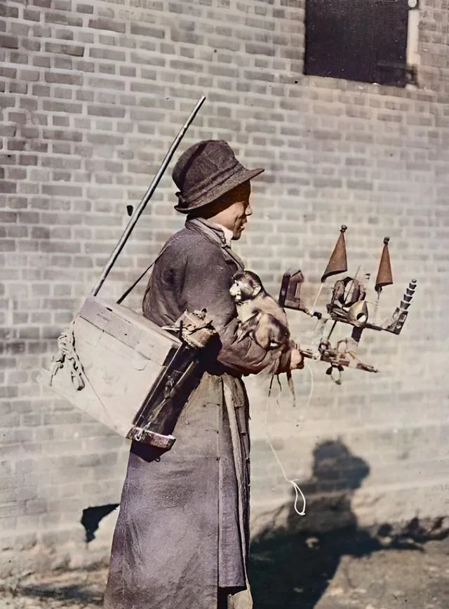 图里这位挑着木箱,胳膊窝着一只小猴子,手里还端着个立着小旗的木架,一开嗓就招合了人气,猴子顺着杆子翻了个跟头,孩子们拍起手来,娘在旁边说,别靠太近,小心被勾着衣角了,伶俐的小把势,换来一把铜板和一口热饭。