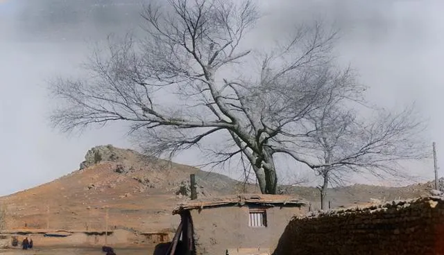 这张在山脚,屋子是土坯垒起的小房,窗格子细细的,门口一棵光秃树叉往外伸,风一来,沙尘顺坡往村里打,小时候路过这种房,我总觉得它们贴着地皮喘气,静静守着季节的进退。
