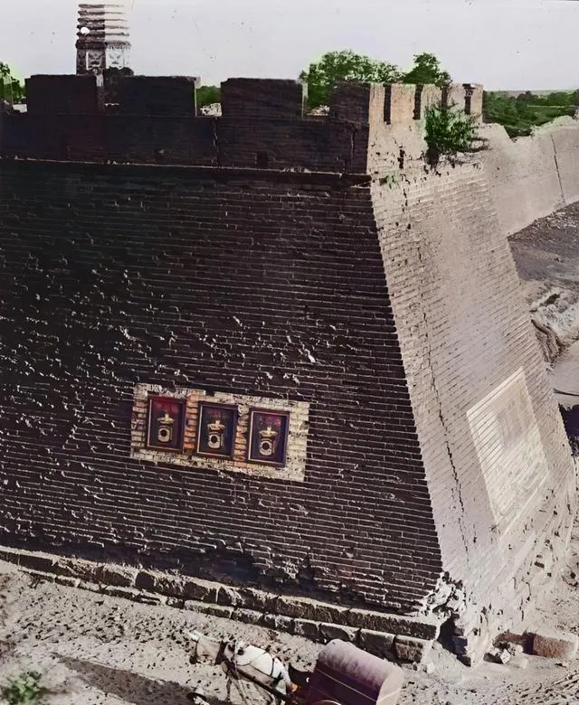 这段城墙脚大头小,砖缝里生着草,墙面上贴着三张招贴画,角门下有人牵着牲口走,远处露出一截塔身,车辙在墙根绕个弯,过去的城防正经干活,现在的城墙更多是城市客厅,晚上都拿来跑步遛弯。
