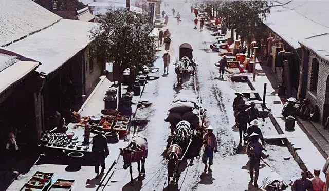 街道笔直,马车在中间走,摊贩把货摆到了屋檐下,陶盆铁器反光亮眼,行人拎着布袋挑挑拣拣,孩子蹲在地上玩泥,商号门口挂着长牌匾,现在逛商场看的是灯光设计,过去看的是手艺的亮堂。