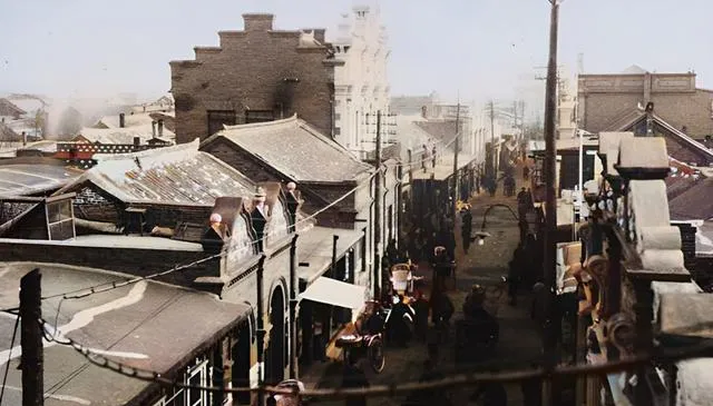 这张是从高处望下去的街景,电线杆稀稀拉拉,屋顶一排排是青灰瓦,街上有黄包车也有骑自新车的,远处一座大建筑撑住天际线,和现在的高楼玻璃幕墙比起来,当年这点热闹,已经算是城里最洋气的地段了。