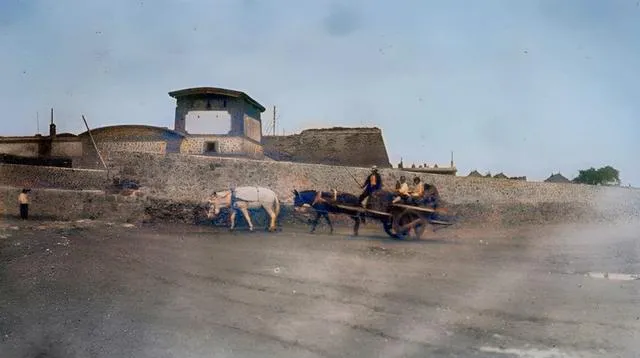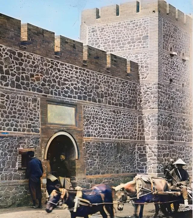 城门楼的墙面是碎石嵌成的花纹,门楣上开着小圆拱,边上站着看门的,街口一队牲口拉着车慢慢过去,石缝间抹灰抹得很细,带着点子洋气的规整,在那个年代算是新式样。