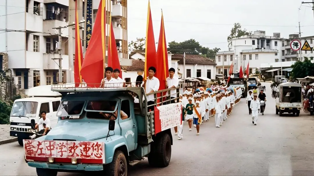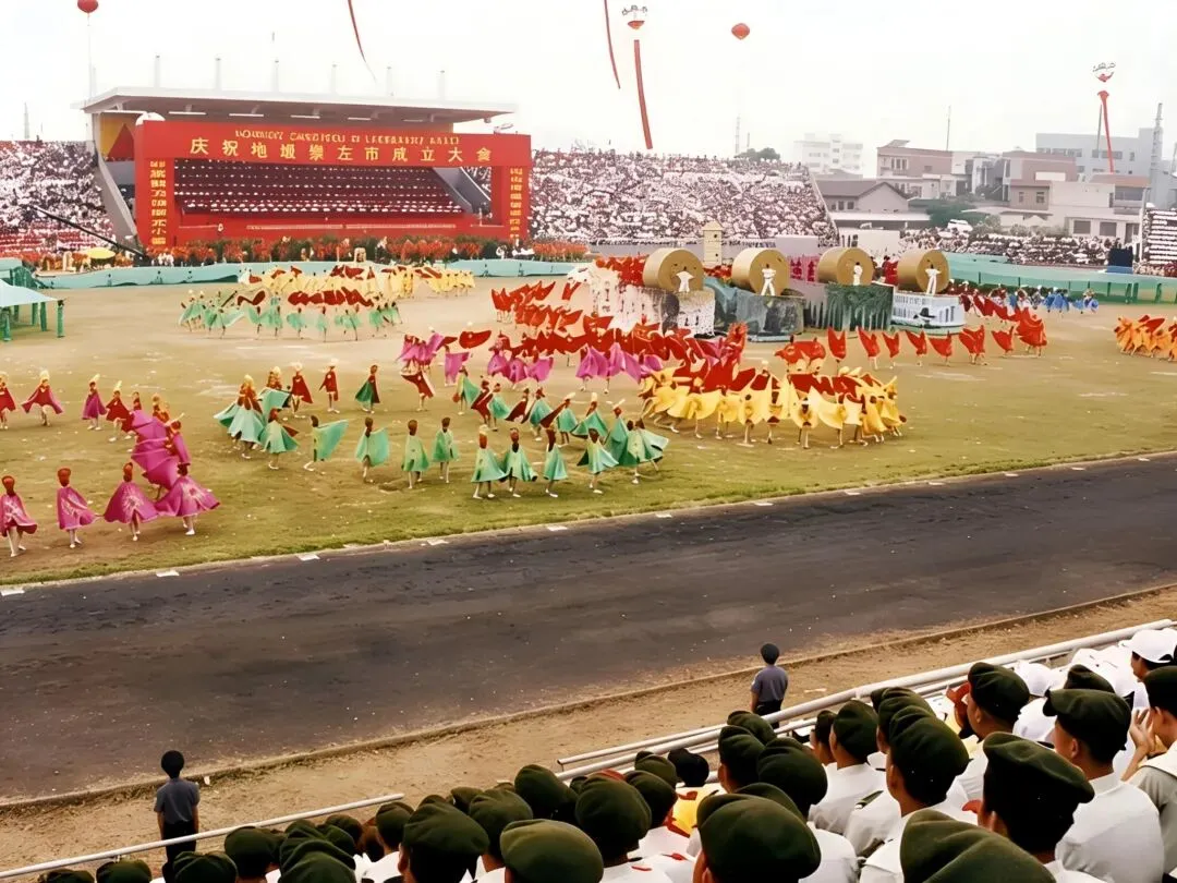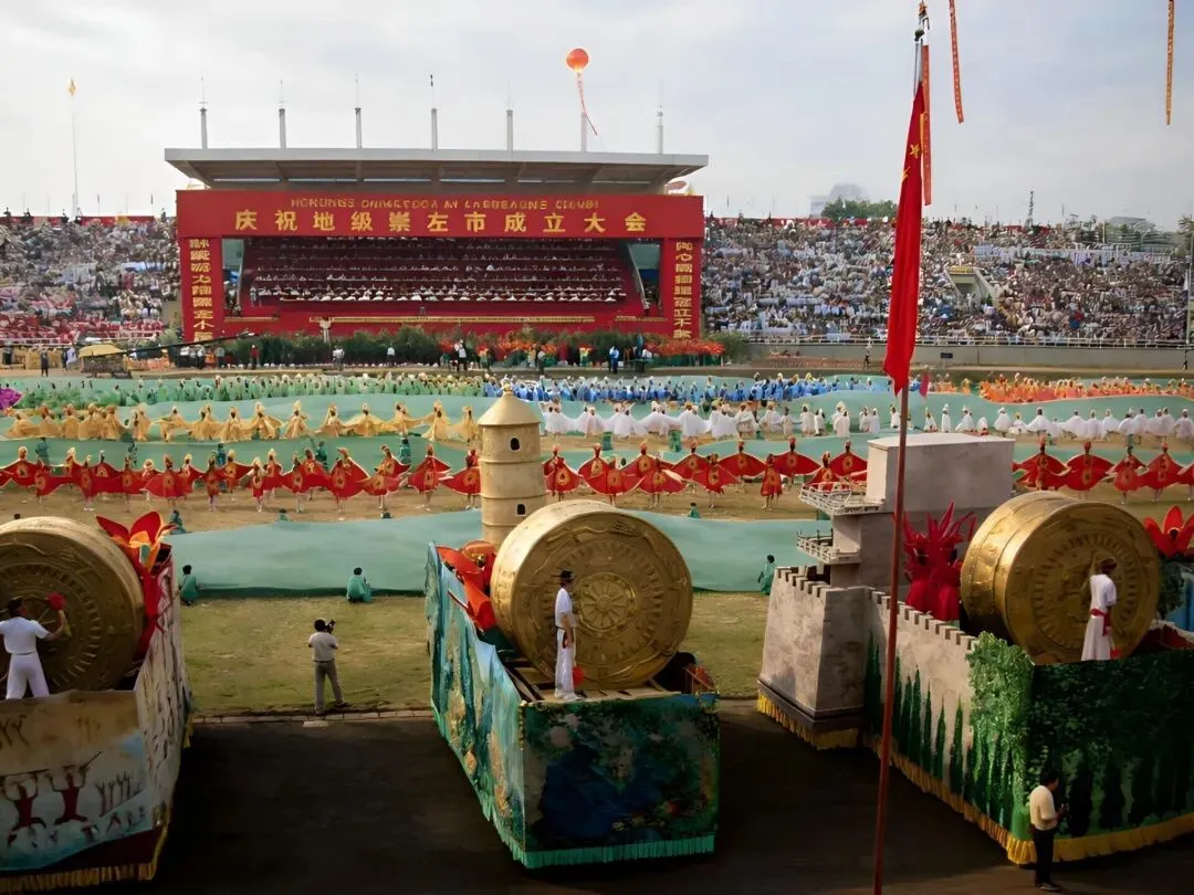 2003年8月6日,庆祝地级崇左市成立的大会在新建的体育场举行。老照片记录下这一历史性时刻:红色的背景墙上写着“庆祝地级崇左市成立大会”,数万群众挥舞着彩旗,穿着民族服装的表演队伍在草坪上组成“团结”“发展”的字样,巨大的铜鼓模型象征着这座城市的新生。从“崇左县”到“崇左市”,一字之变背后,是从农业县到区域中心城市的跨越。