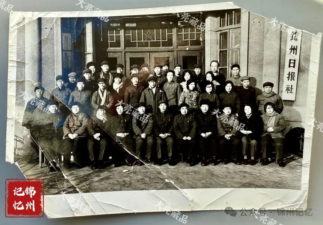 照片的尺寸是15*10.5厘米,背景房屋大门右侧的墙上悬挂的“锦州日报社”牌匾明确了照片的拍摄地点,这里是锦州日报社的原办公大楼。根据历史资料显示,日报社在1969年11月6日搬入这座楼房办公,直到1997年搬出。印象中记得楼房是红砖砌筑的二层楼,风格偏向苏式,坐北朝南,位置在上海路与山东街十字路口西北角。这栋楼房有两处结构是与众不同的,一是正门上部的窗户样式。大楼正门位于楼房中部,朝南开,上图的照片就在大门口拍摄的。正门二层处的窗户不是常见的对开式,而是设计成平行的四条长方形,每一条的宽度是旧时单扇木质窗那么宽,高度大约有4、5米。二是人字形屋顶在距边缘占总长度三分之一处、两端对称各有一个突出部分,并且南向还有对开的窗户,这个部分叫“老虎窗”,如果把整栋楼比作飞机,那么这两个“老虎窗”就好比飞机的发动机。它的作用除了通风之外,另外就是可以直接登顶,便于维修屋顶瓦片,两全其美吧。