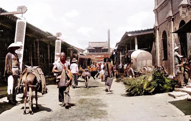 这个热闹场面是一条关城里的老街,两旁屋檐压得低低的,门口搭着阴棚,商贩牵着驴穿街走巷,卖柴的、卖青菜的、修补的都在这儿扎堆,远处一抬头,能看见城楼的檐脊压过来,市声像潮水一样涨落。