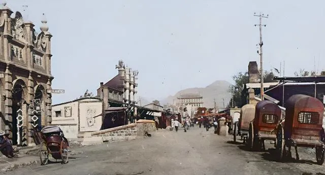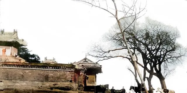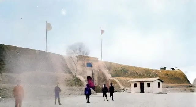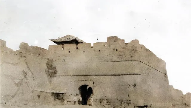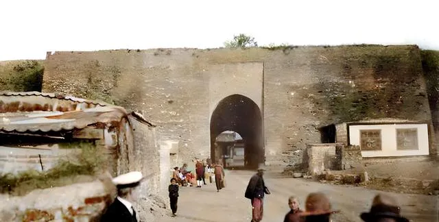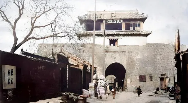 这处城门外,旗杆插在土台上,风一大旗子打着卷,门洞阴影里进进出出的人影不断,门边的小白屋多半是守更歇脚的地方,老照片里灰尘扬起来,像把时间也扬散了。