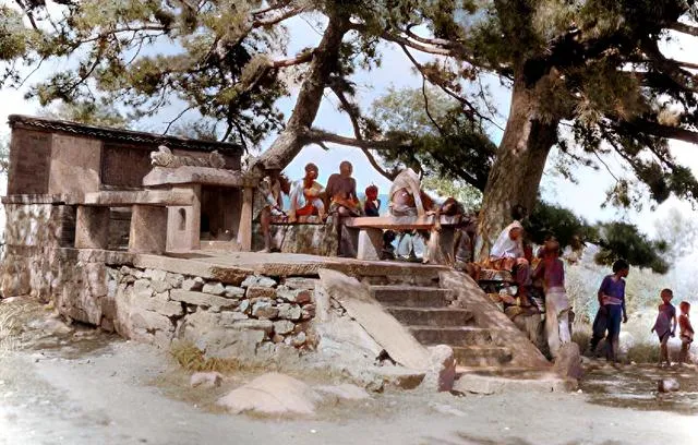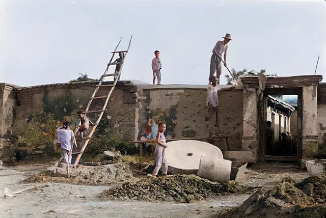 这家人正修屋,梯子搭在矮墙上,孩子们猴一样上上下下,大人抡着锹往院里抬土,地上一块大石磨盘靠着墙,太阳晒得墙皮冒白光,妈妈看了这张照片笑说“那时候修房,全村都是帮手”,一声招呼就齐了人。