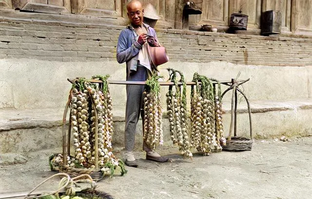 这个男人的扁担挂满了蒜辫子,白蒜头夹着青叶子,串得匀称,站在砖台前抹汗,嘴里还不忘跟人砍价,小时候我跟着大人赶集,最爱看他一把把理蒜叶,手快得很,转眼就扎好了。