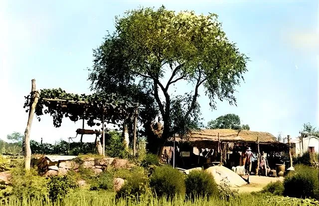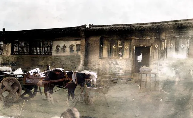 门口写着“老店”两个字,墙上土灰脱落露出砖缝,马车停在槽旁吃料,车辕靠着台阶,赶车人叼着草根站在一边打盹,那会儿出门办事,住客栈讲究干净和热水,别的都能将就。