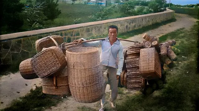 肩上这根扁担不轻,一头是圆口的大篓,一头是方形提篮,竹篾子编得紧,边口抹得顺溜,小贩走一路叫一路,竹器在风里碰碰响,买回家的当筛子当笼屉都行。