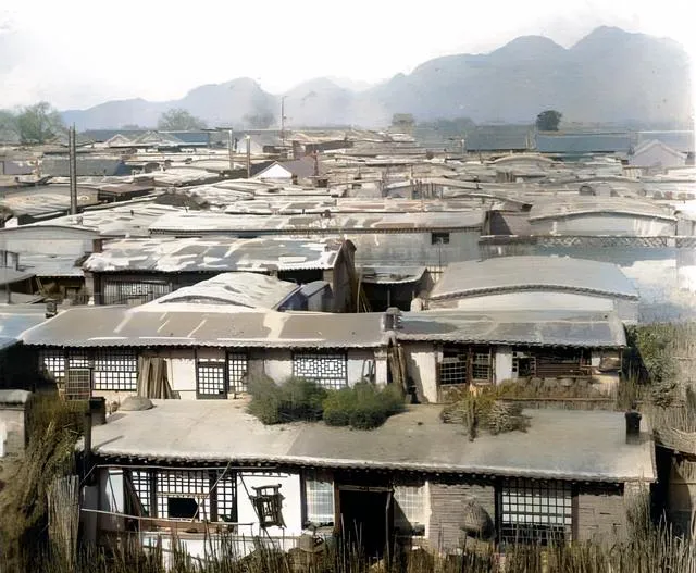 这一片屋顶铺开去像灰色的海,前排窗棂是方格子,院里支着晒衣杆,远处的山线淡淡的,奶奶说那时候住得挤,可邻里熟,晚上串门借火,喊一声就来了人。