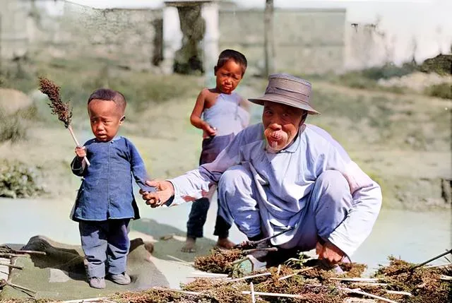 三个孩子站在矮墙根,一身打着补丁的小褂子,脚丫子上粘着土,眼神亮亮的,看到镜头有点拘谨又好奇,奶奶说“那会儿,孩子们玩儿的快乐,不用花钱,跳沟上树就够了”。