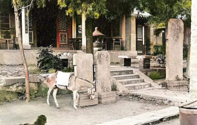 这处院子像是老寺的前殿,石碑立在台阶旁,字被风沙打磨得发浅,一头毛驴拴在碑旁低头找草,门洞里露出半截木门,铜钉还在,寺里的人多半忙着烧水接客。