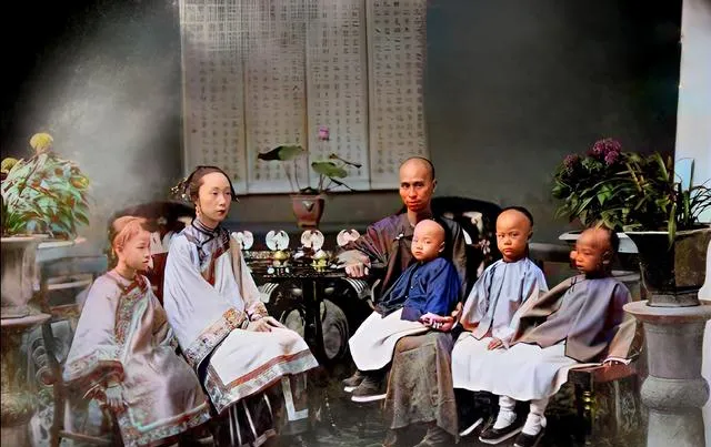 桌上摆着几盆花,后墙贴着字帖,男人穿便服坐正中,妻子端庄,孩子们一排坐得直溜,能拍这样的合影,说明日子稳,心气也稳。