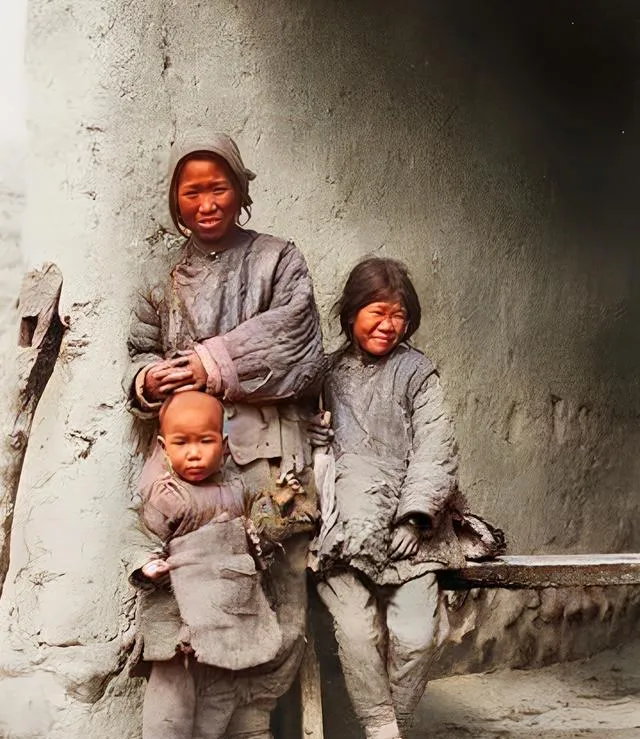 泥墙裂缝像干涸的河,孩子袖口垂着线头,女人眯眼望着太阳,鞋面全是土疙瘩,照片里最亮的是孩子的额头,汗珠一点点往下滚。