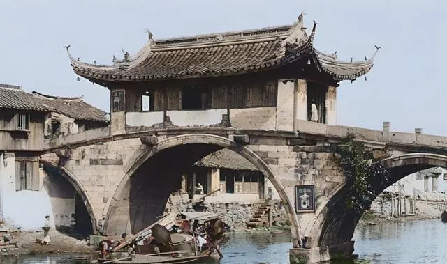 图中这座三孔石拱桥叫普福桥,桥身弧背高挑,桥亭檐角飞起像展翅,石料颜色已经被水汽磨出旧痕,桥洞下小船穿行,艄公一篙一点就顺水过去,爷爷说,以前沿着运河进府城的人,一看亭子桥就知道进了苏州地界了,现在大船多了,老桥早不见了。