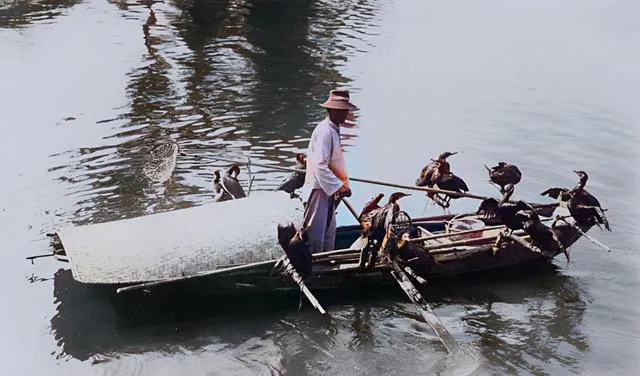 这个画面最有味道,一条小船上蹲着一圈黑亮的鸬鹚,脖子上拴着细绳,渔人袖口卷到手肘,竹篙轻点就滑出一道水纹,妈妈看见这张照片笑着说,以前见过师傅们收工,把鱼从鸟嘴里抖到篓子里,咯一下脖圈就松开了,动作熟练得很。