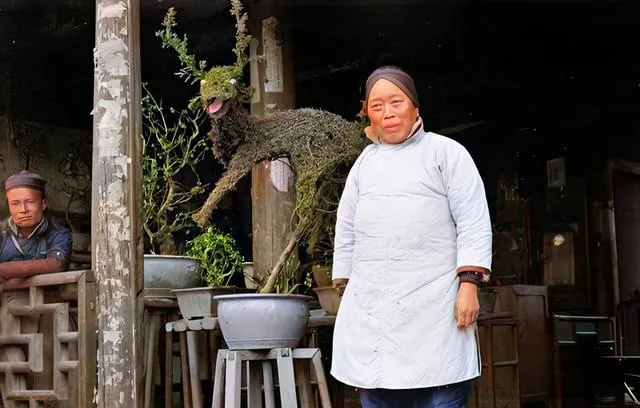 这位掌柜站在门口,白袍整洁,身后木架上盆景一盆挨一盆,做成鹿形的草扎栩栩如生,店里光线暗一点,更显绿意清凉,那时候没有玻璃橱窗,做买卖就把好东西摆到门前,邻里路过停一停,生意自然就来了。