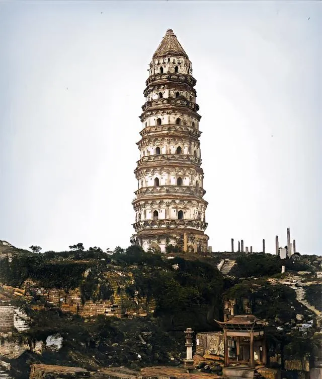 这个高塔就是虎丘塔,七级八面,砖木交错,身子微微倾着,像在风里驻足,老照片里能看出层檐缺角与爬满的青藤,爸爸说,第一次爬到山顶,抬头望塔心里有点发怵,可还是要拍一张照留念,毕竟江南第一名刹旁的斜塔,说出去倍有面子。