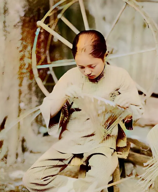 图中姑娘专心编竹,指尖灵活,竹篾在手里一折一挑,细细的纹路像溪水,小时候见过外婆坐在门槛上编筐,嘴里叼着竹片尾,轻轻一提就合了口,现在买筐篮方便是方便,却少了这份手上的温度。