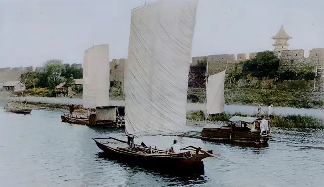 这一幕最好看,白帆迎风鼓起,船身从城墙下划过去,水面被刀一样劈开一道光,城楼在背后稳稳立着,百年前的航运就这么忙,今天看依旧带劲。
