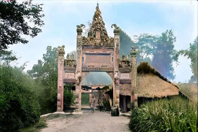 图中这座三门石牌坊气势不小,顶上堆着一层一层的雕饰,瑞兽蹲在柱头把路口看得紧,人从中门进出,侧门窄一些,旁边靠着几间草房,屋檐压得低低的,门口坐着人歇脚,奶奶说老早这里就是集口,抬轿的、挑担的都要在牌坊下缓一缓,现在路面铺成柏油了,车一脚油门就出村口,过去这口气得在人声里慢慢喘出来。