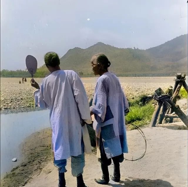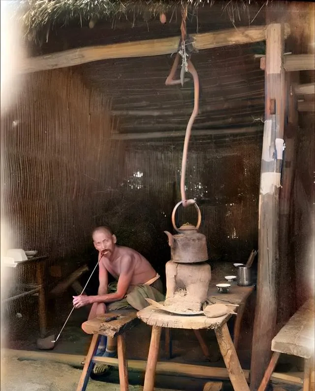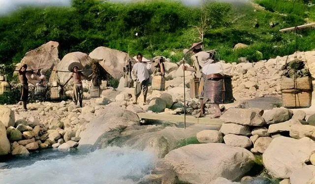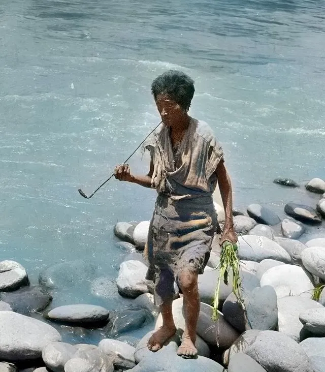 这个大哥光着脚站在圆石上,手上提着从水里捞的草,另一只手还捏着烟袋锅,衣服破了线头也不管,河水冷得清,脚掌贴石头时会麻一阵,那会儿生活紧,烟一口一口抽得更慢,现在我们看着心里发酸,他自己怕是只想赶紧把这顿饭凑齐。