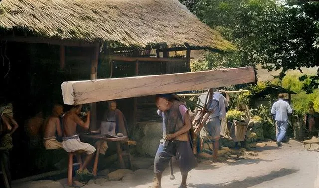 这个家伙头上顶着一根长方木,背后还绑着专用的背架,走到草棚门口时必须侧一下身才过得去,力气不是蛮使,要会把重量往肩背里卸,师傅们总说“横的轻过直的”,现在吊车一抬就到位,老手艺在一句口诀里。