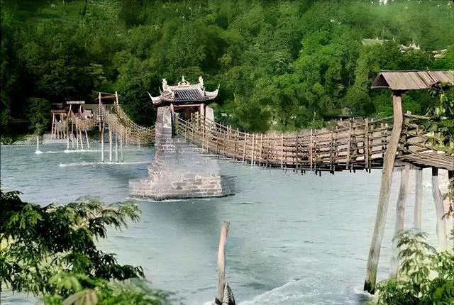 这条索桥绵长得很,桥面木板一节连一节,桥亭像顶簪子插在河心石墩上,水一高桥就轻轻起伏,老人说以前赶集要过桥,风大时就把帽沿按住,现在游客拍照要等桥身稳一稳,其实抖几下才是它的脾气。