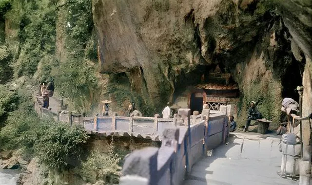 这个小庙就嵌进山体里,栏杆刷成淡淡的青色,洞口摆香案,石壁上挂着苔,来往的人在这里歇脚喝水,问路也方便,庙小心不小,给行人一口气喘的地方,这句话是奶奶说的。