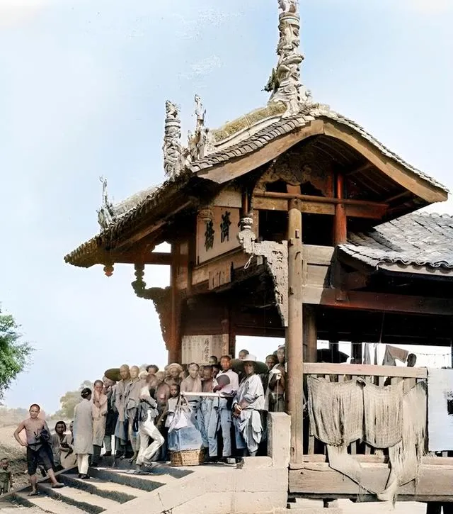 桥头的亭子雕梁画栋,檐头挑起一点翘,木刻龙头盯着河心,人群挤在台阶上乘凉,门匾“普济桥”三个字写得稳,像给过桥的人加胆,现在亭子重新修过,旧影里的木纹更粗犷,摸上去手会被木刺扎一下。