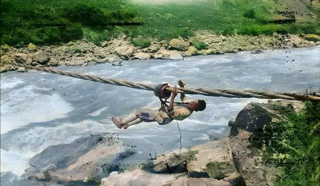这个人用溜索过急水,腰上系着绳套双手抓紧,脚跟在空中蹬一下就滑到对岸,下面是吼叫的水,胆量得够,外公说年轻时也这么过河,抬头看天不看水,心里就不慌,现在修了桥,溜索成了表演,惊险留在故事里。