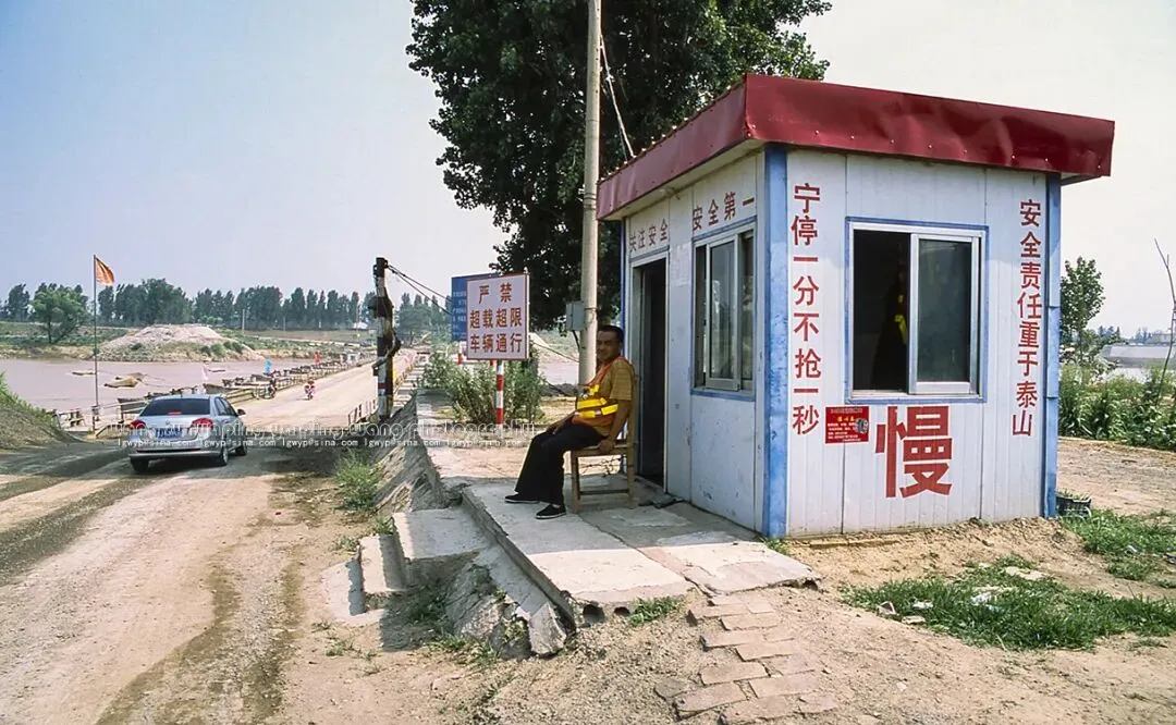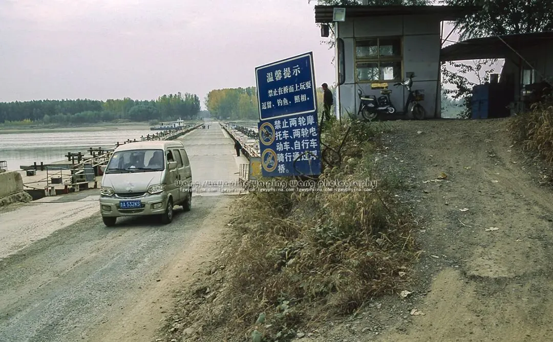 一辆面包车从浮桥上迎面驶来,站在高处安全岗前的安全员观察着桥面情况,坡面上树立的安全提示牌格外醒目。