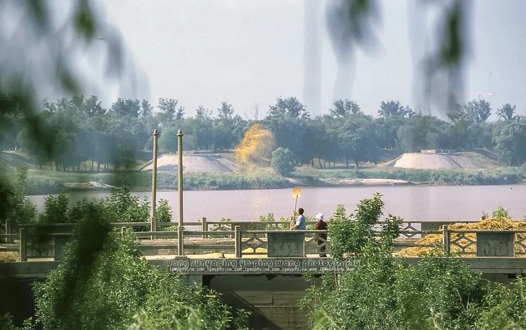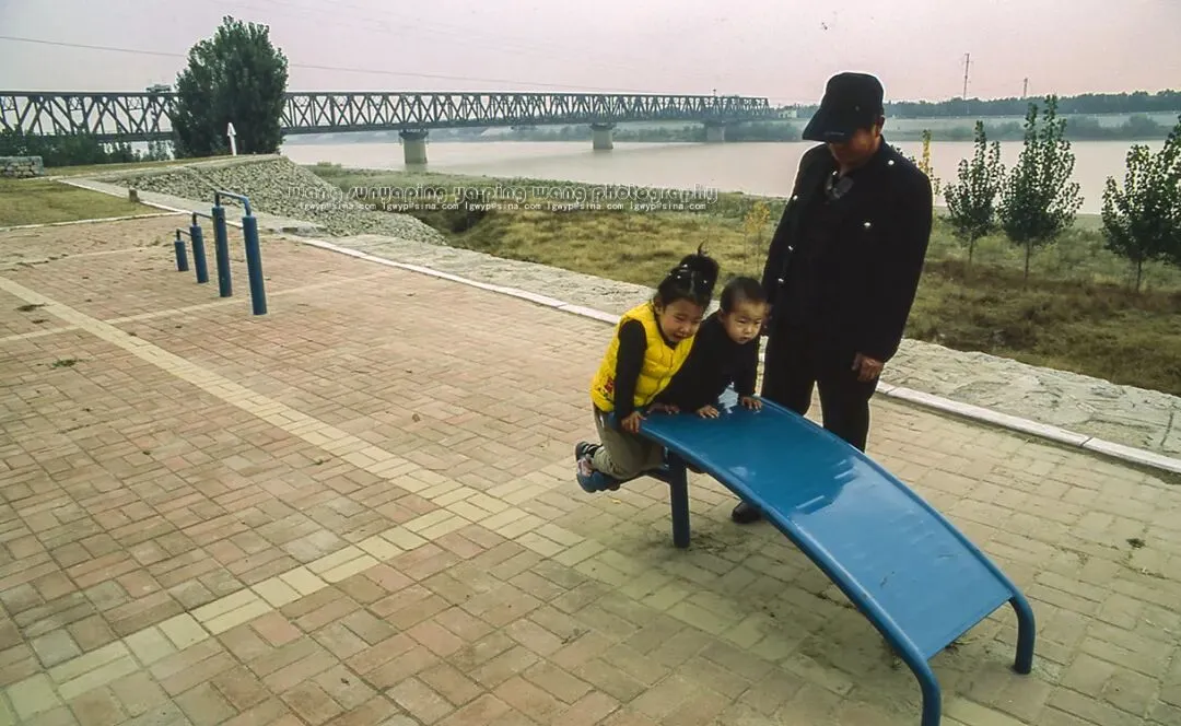 京沪铁路黄河大桥上游,祖孙三人在黄河大堤玩耍。
