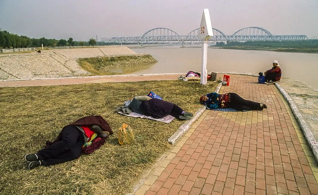 京沪高铁黄河大桥上游,黄河大堤上维护大堤的农民工在休息。