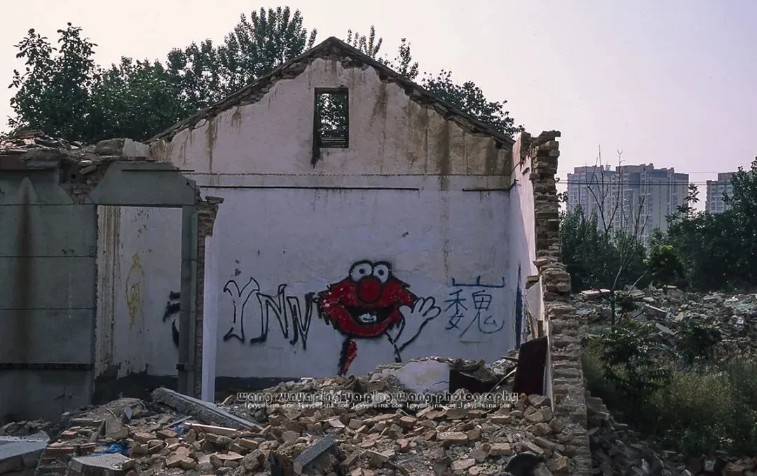 黄河滩区移民拆迁房上的涂鸦。