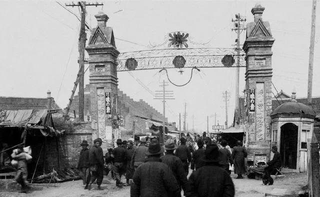 图中这座新式大门叫朝阳门,铁廊横在街心,三字牌匾挂得正正当当,两侧立柱是欧式的造型,门旁还立着岗亭,进出的人群裹着厚棉袄,帽檐压得低低的,电线杆一路排过去,城里的新鲜事物就这么沿街伸过去。