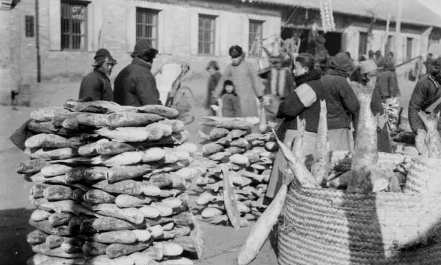 这摊位上的货叫冻鱼,条条被冻成硬梆梆的板子,摞得有一人多高,买鱼的人捏着鱼尾瞅一眼就知道肥瘦,在南方是水里捞着卖,在这儿就靠天帮忙,冷得利索。