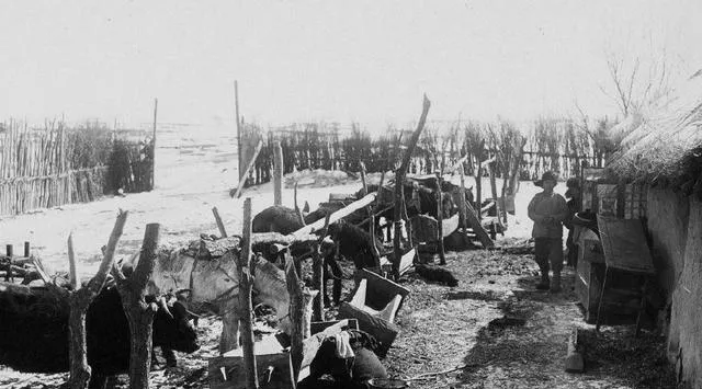 这一溜木桩绑着牲口,槽里塞着草料,院墙是泥坯垒的,路面结着疙瘩硬冰,男人从棚下穿过去,打量着哪匹马要添点料,老东北的院子就这样,一半给人住,一半留给牲口。