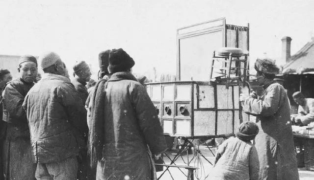 这个装置叫拉洋片,又叫西洋镜,木箱子上一个个观察孔,摊主喊一声开演喽,大家凑上去看画片变换,简简单单的玩意儿,乐趣可不小。