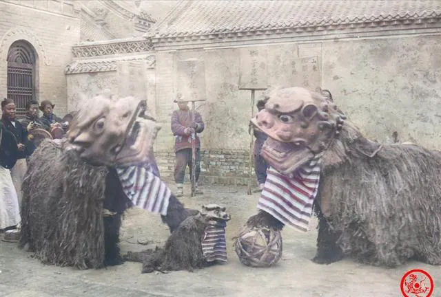 这张拍在山东的北关,场子里摆着花船架,狮头毛色鲜亮,鼻梁高鼓,锣鼓一响,两个小伙子一前一后把狮子翻得呼啦啦,孩子跟在后面学学样,大人把围裙一擦就上手帮忙,民间的喜事就是这么自来熟,过年压岁,秋后庆收,大家伙你一句我一声,图个兴旺和平安。
