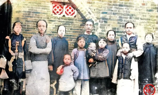 这个合影热闹,男女老少一字排开,砖墙当背景,孩子们眼睛亮亮的,衣襟上还带着补丁,男长者戴瓜皮帽,女眷袖口宽大,站姿各不相同,镜头抓住的是一家子的精气神,小时候我最爱翻家里旧照,奶奶总说别看衣裳素,一家人站到一块儿最体面。