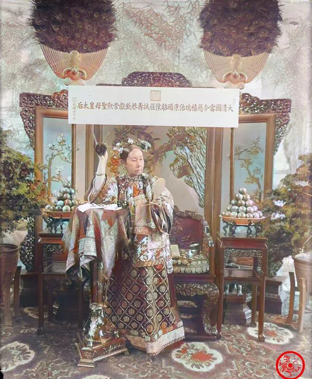 这张最出名,案几盖锦缎,牡丹纹样一层叠一层,摆屏后面铺着孔雀尾屏风,慈禧太后手里捏着小团扇,另一只手托着铜镜,镜面暖黄,发饰上垂着珠坠,她微微侧脸,像是在审视额前那一缕鬓角,桌上茶盏、小箪子排得利落,宫里讲究细密到这一口茶该放哪儿都规矩着来,奶奶看了笑我说,人家这叫**“照容”**,不是照相那么简单。