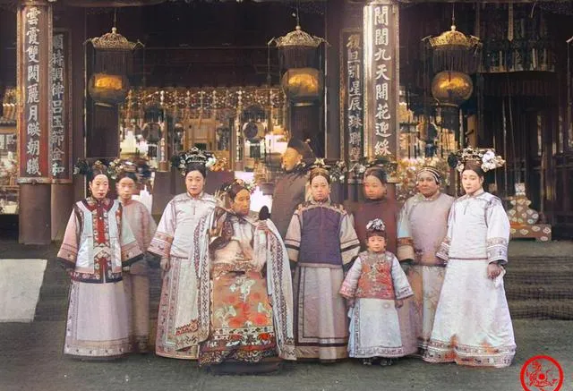 这回把人都请到了门前,牌匾挑得高,灯罩沉沉垂着,站在中间的仍是主位,左侧右侧一圈人簇着,旗头压得稳当,袖口里藏着绣花的喜头儿,站在后排的太监侧着脸,略躲镜头,风一吹衣摆起了层次,场面虽静,礼制的味道却一点没少,妈妈看见这张低声说,你瞧那两位姑娘脚上“花盆底”多秀气,不好穿,可一走起来就挺身直背。
