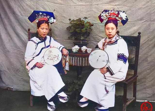 这张合影的细节鲜,旗装洁白里嵌藏蓝滚边,袖头一圈蓝线绕得利落,头上旗头横展,花簪簇拥,脚下“花盆底”踩得稳稳的,两人各拿一柄绣花圆扇,唇上口脂只在中段点了个厚,远看就是传说里的**“樱桃小嘴”**,桌上摆一盆小草,旁边茶盏排排坐,安静里透着讲究。