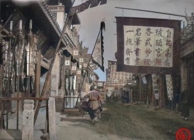 这个街口旗杆子一溜排开,幌子挂得比人还高,招牌写满了玻璃器、笔墨纸砚、各式修配,门面前搭了木栏杆,里头有人探身擦器物,街心踩出两道辙,背着布包的人从牌坊下穿过去,店招一句比一句响亮,字比人先喊话,想要什么,往哪家拐都写在空中,奶奶说那时候逛街不宽敞,但热闹劲儿不打折。